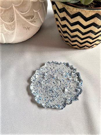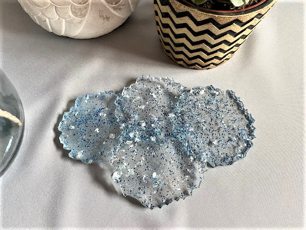 Ajoutez une touche d'élégance à votre table avec ces superbes sous-verres en résine. Ces sous-verres asymétriques sont magnifiquement transparents et présentent un design accrocheur de paillettes bleues et de feuilles d'argent.