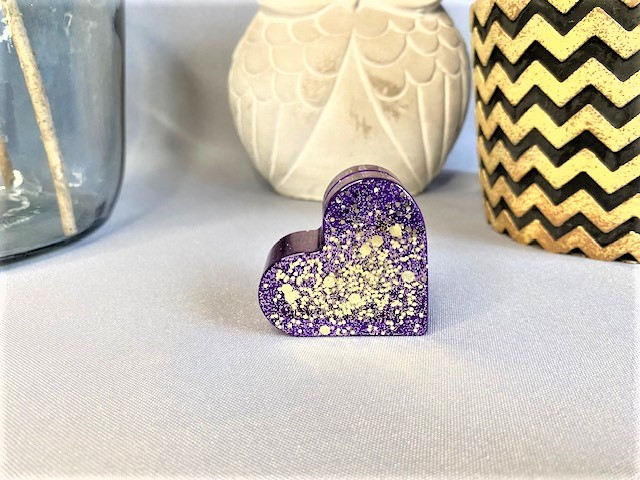 Rehaussez le style de vos précieux souvenirs avec notre porte-photo en résine. Ce porte-photo en forme de cœur est disponible dans une superbe teinte violette, rehaussée de paillettes dorées scintillantes pour une touche glamour.